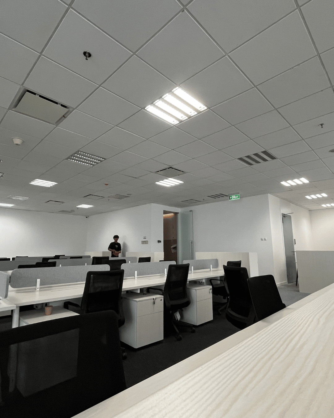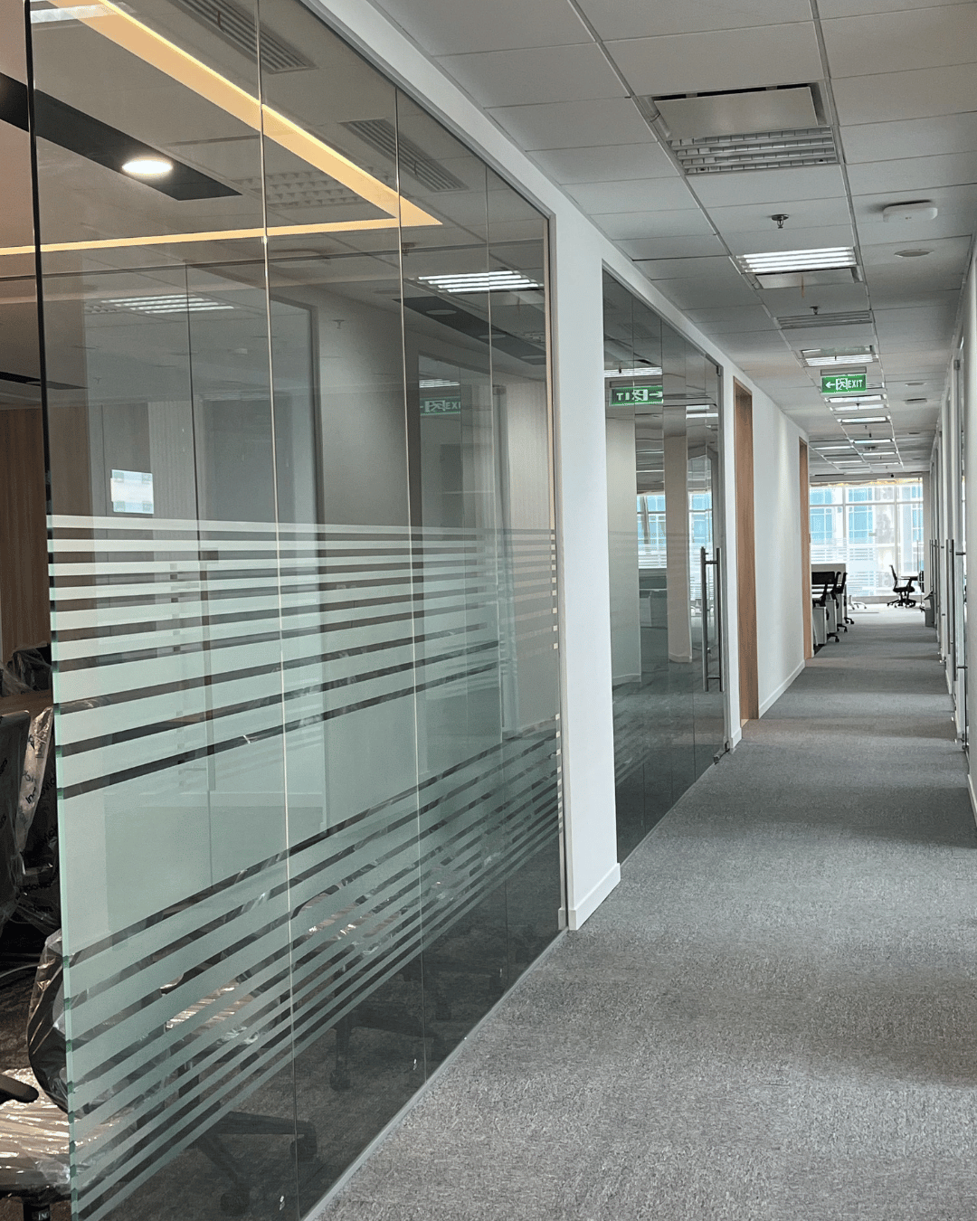 Proyek pemasangan partisi kaca kantor dan pintu kaca sliding untuk kebutuhan gedung komersial dan retail space modern.